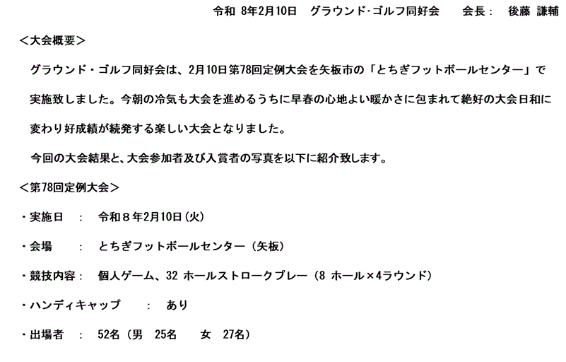 令和 8年1月16日 グラウンド・ゴルフ同好会 会長:後藤 謙輔