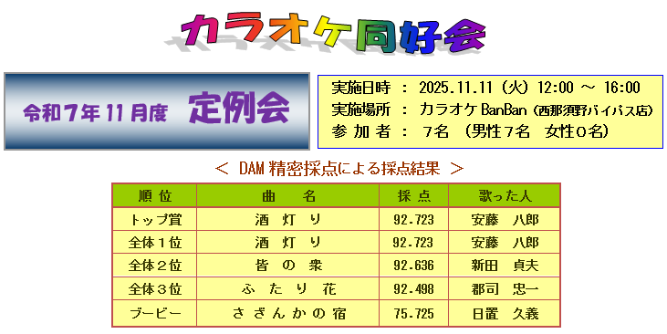 今回は男性7名の参加で順番に合計6曲を歌い | |