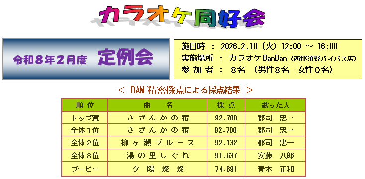 今回は男性8名の参加で順番に合計5曲を歌い | |