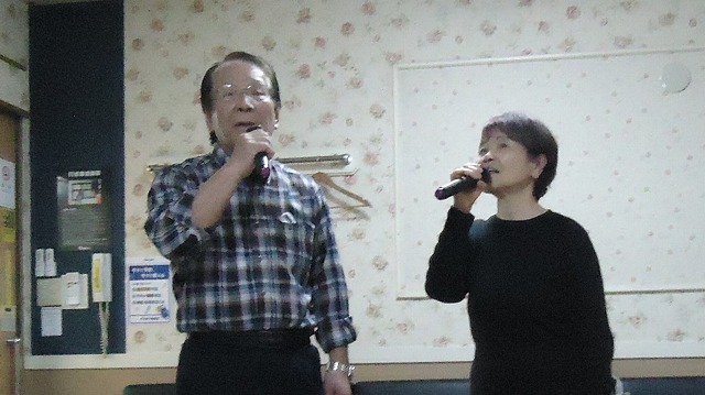 | 「ふたりの大阪」をデュエットする津久井さんと黒須さん | |