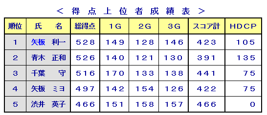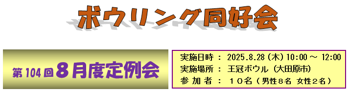 今年からハンディは前3回の成績を基準として設定する方式に変更され、今回は1ゲームに付き 50点 〜 0点のハンディ込みで、3ゲームの競技を実施しました。 競技結果はハンディ込みの点数で528点〜413点の戦いとなりました。 優勝:矢板利一さん (528点) 2位:青木正和さん (526点) 3位:千葉 守さん (516点) 《 参加者全員の得点詳細は、 『成績表』を参照して下さい 》 参加した皆さん、お疲れ様でした。 令和7年9月度定例会は9月25日(木)午前10時〜『 王冠ボウル 』 で実施します。 ・・・ 社友会会員皆様の新規入会をお待ちしています!! ・・・ |