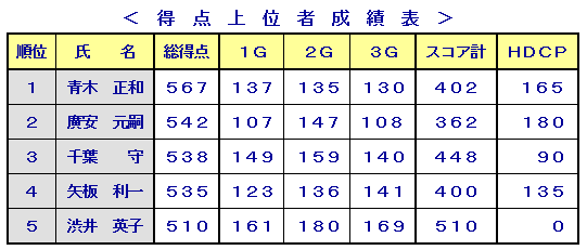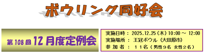 今年からハンディは前3回の成績を基準として設定する方式に変更され、今回は1ゲームに付き 60点 〜 0点のハンディ込みで、3ゲームの競技を実施しました。 競技結果はハンディ込みの点数で567点〜341点の戦いとなりました。 優勝:青木正和さん (567点) 2位:廣安元嗣さん (542点) 3位:千葉 守さん (538点) 《 参加者全員の得点詳細は、 『成績表』を参照して下さい 》 参加した皆さん、お疲れ様でした。 令和8年1月度定例会は1月15日(木)午前10時〜『 王冠ボウル 』 で実施します。 ・・・ 社友会会員皆様の新規入会をお待ちしています!! ・・・ |