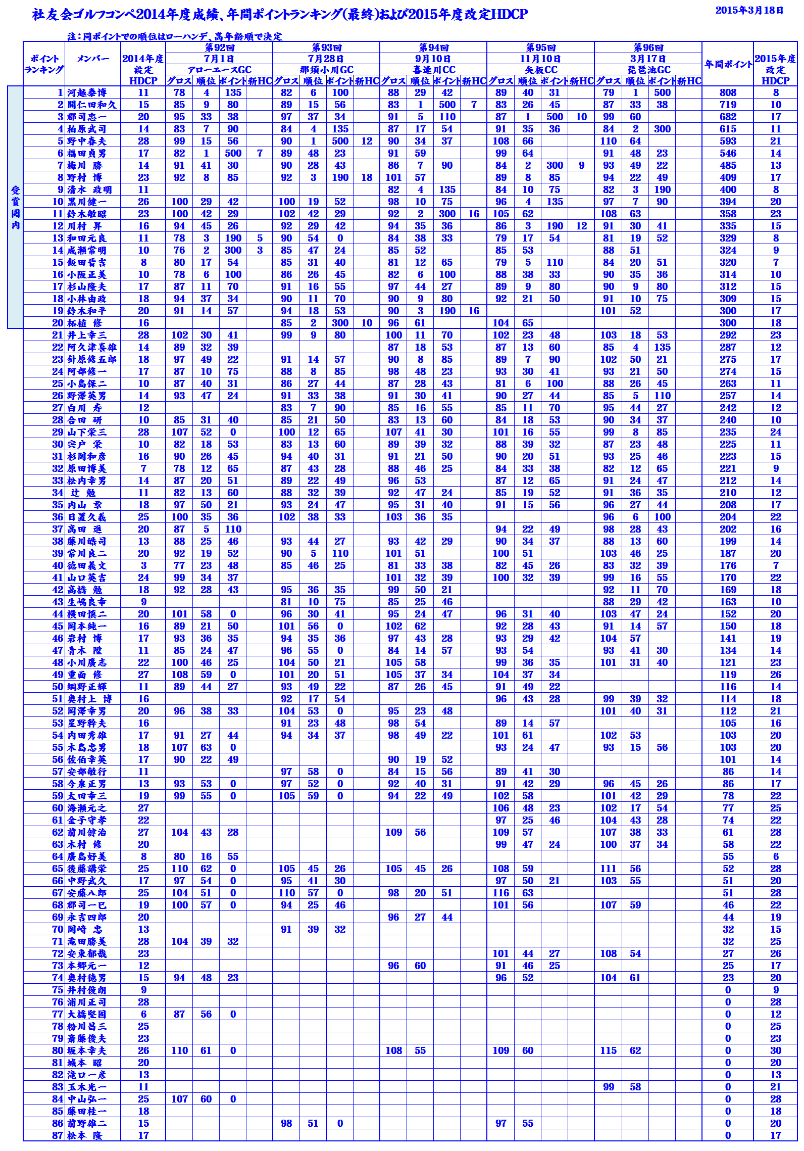 ※2015年度改定HDCPは規定により2014年度の平均スコアのオーバーパー値に 8掛けし、小数点以下は切捨てして算出しています。2014年度に参加がなかった方は2014年度HDCPを継続しています。