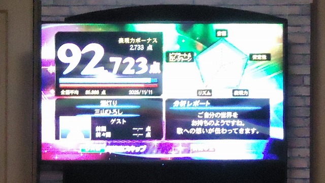 | 安藤さんが「酒灯り」を歌い、出した最高得点画面 | |