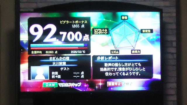 | 郡司さんが「さざんかの宿」を歌い、出した最高得点画面 | |