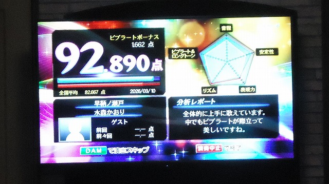 | 郡司さんが「早鞆の瀬戸」を歌い、出した最高得点画面 | |