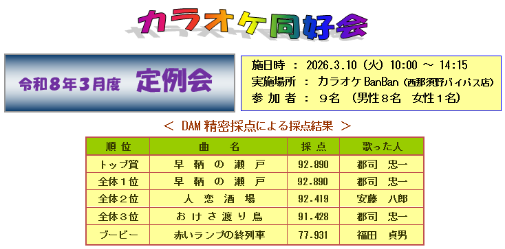 今回は通常より開始時間を2時間早めて、男性8名、女性1名の参加で順番に合計6曲を歌い | |